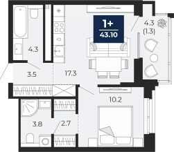 Продается 1-комн. квартира от застройщика с предчистовой отделкой в ЖК "Мириады" на 9 этаже. Общая площадь: 43.1 кв.м., жилая: 10.2 кв.м., площадь просторной кухни-столовой: 17.3 кв.м. Все окна выходят на одну сторону. В квартире один балкон, два совмещенных санузла. Высота потолков 2.7 м.