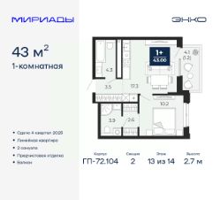 Просторная 1-комн. квартира с предчистовой отделкой в ЖК "Мириады" на 13 этаже. Общая площадь: 43 кв.м., жилая: 10.2 кв.м., площадь просторной кухни-столовой: 17.3 кв.м. Все окна выходят на одну сторону. В квартире один балкон, два совмещенных санузла. Высота потолков 2.7 м.