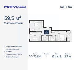 2-комн. квартира от застройщика с предчистовой отделкой в ЖК "Мириады" на 15 этаже. Общая площадь: 59.5 кв.м., жилая: 27.8 кв.м., площадь просторной кухни-столовой: 16 кв.м. Угловая квартира, идеально подойдет любителям тишины и панорамных видов. В квартире одна лоджия, один совмещенный санузел. Высота потолков 2.7 м.