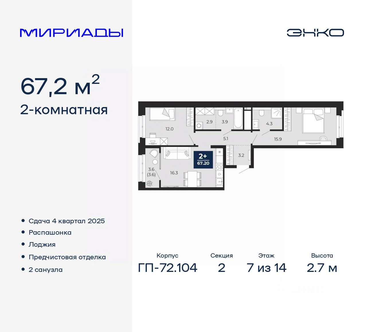 Продается 2-комн. квартира от застройщика с предчистовой отделкой в ЖК "Мириады" на 7 этаже. Общая площадь: 67.2 кв.м., жилая: 27.9 кв.м., площадь просторной кухни-столовой: 16.3 кв.м. Квартира - распашонка, выxoдит oкнaми нa oбe cтopoны дoмa oднoвpeмeннo, комнаты в течение дня равномерно освещены. В квартире одна лоджия, два совмещенных санузла. Высота потолков 2.7 м.