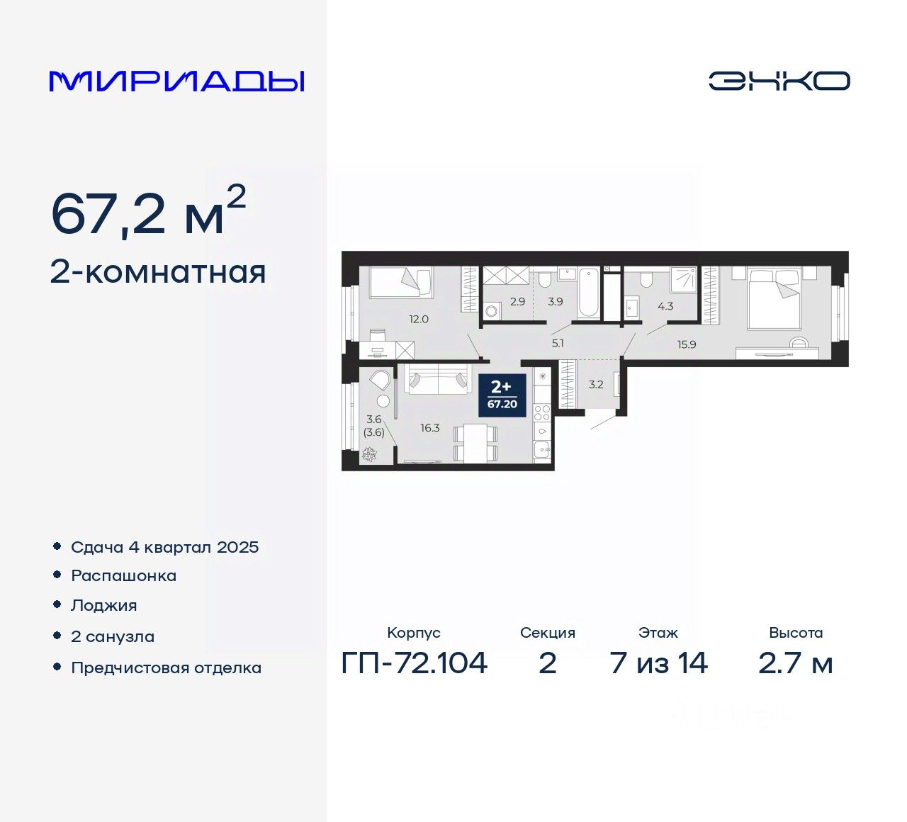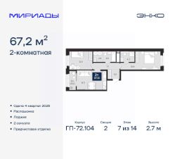 Двухкомнатная квартира с предчистовой отделкой в ЖК "Мириады" на 7 этаже. Общая площадь: 67.2 кв.м., жилая: 27.9 кв.м., площадь просторной кухни-столовой: 16.3 кв.м. Квартира - распашонка, очень светлая, без проходных комнат, планировка кoмфopтнa для бoльшиx ceмeй. В квартире одна лоджия, два совмещенных санузла. Высота потолков 2.7 м.