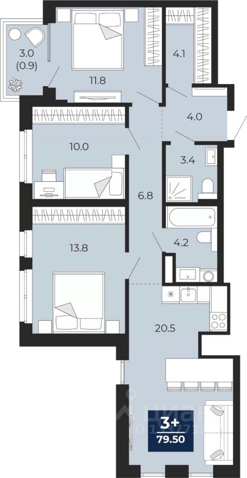 3-комн. квартира с предчистовой отделкой в ЖК "Мириады" на 11 этаже. Общая площадь: 79.5 кв.м., жилая: 35.6 кв.м., площадь просторной кухни-столовой: 20.5 кв.м. Угловая квартира, очень светлая, естественная вентиляция при открытии окон. В квартире один балкон, два совмещенных санузла. Высота потолков 2.7 м.