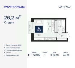 1-комн. квартира-студия с предчистовой отделкой в ЖК "Мириады" на 3 этаже. Общая площадь: 26.2 кв.м., площадь гостиной 18.4 кв.м., из которых 6.1 кв.м. выделено под кухонную зону. Все окна выходят на одну сторону. В квартире один балкон, один совмещенный санузел. Высота потолков 2.7 м.