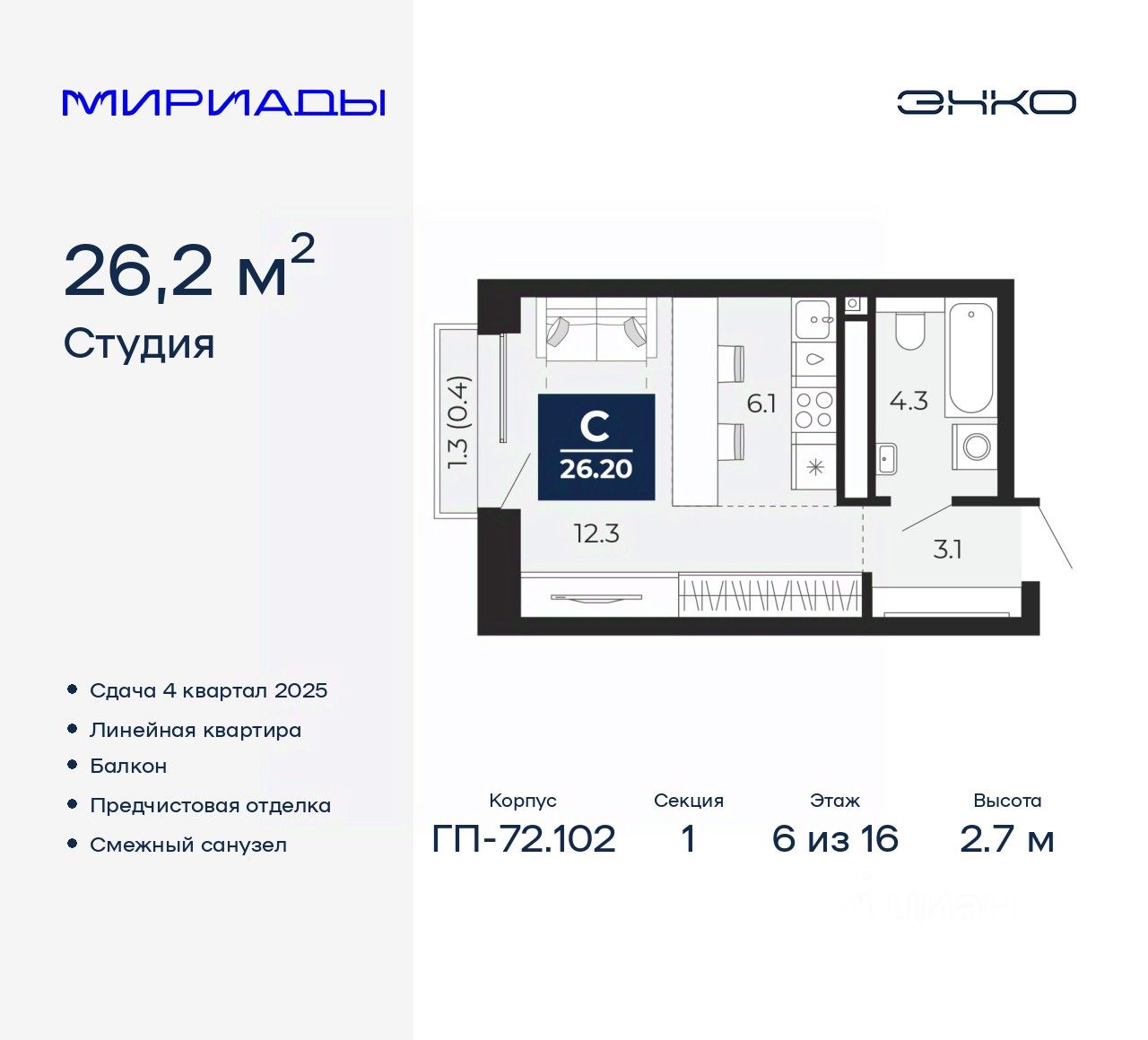 Просторная 1-комн. квартира-студия с предчистовой отделкой в ЖК "Мириады" на 6 этаже. Общая площадь: 26.2 кв.м., площадь гостиной 18.4 кв.м., из которых 6.1 кв.м. выделено под кухонную зону. Все окна выходят на одну сторону. В квартире один балкон, один совмещенный санузел. Высота потолков 2.7 м.