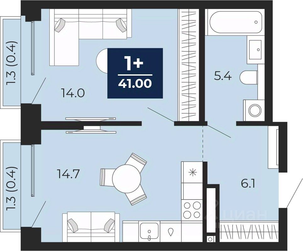 Продается 1-комн. квартира от застройщика с предчистовой отделкой в ЖК "Мириады" на 2 этаже. Общая площадь: 41 кв.м., жилая: 14 кв.м., площадь просторной кухни-столовой: 14.7 кв.м. Все окна выходят на одну сторону. В квартире два балкона, один совмещенный санузел. Высота потолков 2.7 м.
