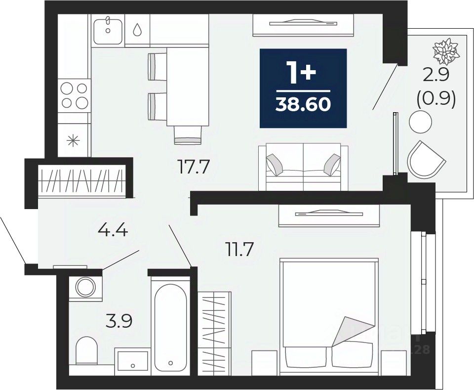 1-комн. квартира от застройщика с предчистовой отделкой в ЖК "Мириады" на 13 этаже. Общая площадь: 38.6 кв.м., жилая: 11.7 кв.м., площадь просторной кухни-столовой: 17.7 кв.м. Все окна выходят на одну сторону. В квартире один балкон, один совмещенный санузел. Высота потолков 2.7 м.