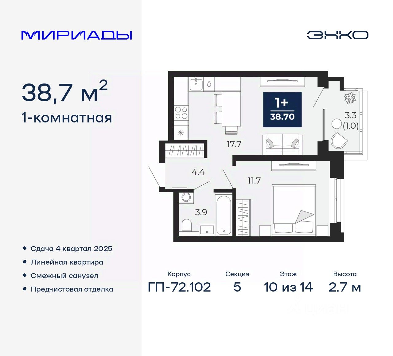 1-комн. квартира с предчистовой отделкой в ЖК "Мириады" на 10 этаже. Общая площадь: 38.7 кв.м., жилая: 11.6 кв.м., площадь просторной кухни-столовой: 18.4 кв.м. Все окна выходят на одну сторону. В квартире один совмещенный санузел. Высота потолков 2.7 м.
