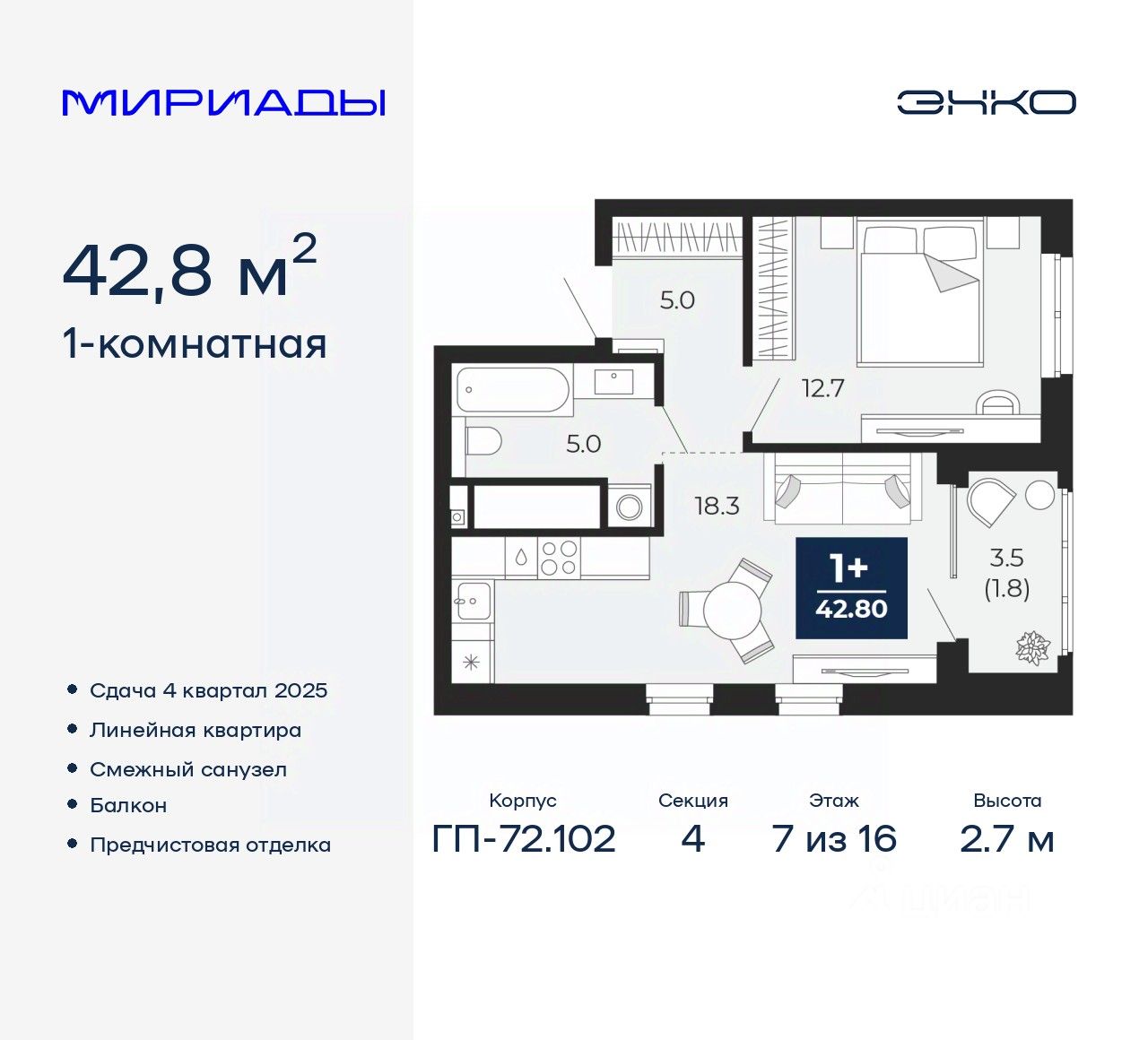 Продается 1-комн. квартира от застройщика с предчистовой отделкой в ЖК "Мириады" на 7 этаже. Общая площадь: 42.8 кв.м., жилая: 12.9 кв.м., площадь просторной кухни-столовой: 16.1 кв.м. Все окна выходят на одну сторону. В квартире один балкон, один совмещенный санузел. Высота потолков 2.7 м.