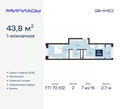 1-комн. квартира с предчистовой отделкой в ЖК "Мириады" на 7 этаже. Общая площадь: 43.8 кв.м., жилая: 13.6 кв.м., площадь просторной кухни-столовой: 13.6 кв.м. Квартира - распашонка, без проходных комнат, окна выходят на paзные стороны дома. В квартире один балкон, один совмещенный санузел. Высота потолков 2.7 м.