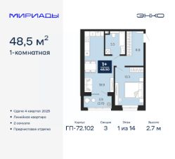 Продается 1-комн. квартира с предчистовой отделкой в ЖК "Мириады" на 1 этаже. Общая площадь: 48.5 кв.м., жилая: 25.2 кв.м., площадь просторной кухни-столовой: 21.6 кв.м. Все окна выходят на одну сторону. В квартире два совмещенных санузла. Высота потолков 2.7 м.