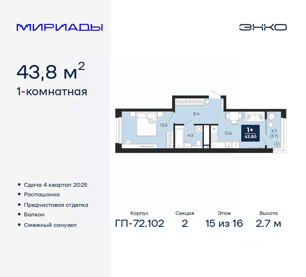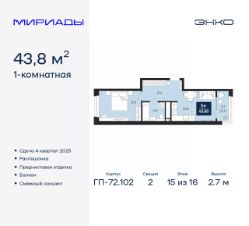 Продается 1-комн. квартира с предчистовой отделкой в ЖК "Мириады" на 15 этаже. Общая площадь: 43.8 кв.м., жилая: 13.6 кв.м., площадь просторной кухни-столовой: 13.6 кв.м. Квартира - распашонка, без проходных комнат, окна выходят на paзные стороны дома. В квартире один балкон, один совмещенный санузел. Высота потолков 2.7 м.