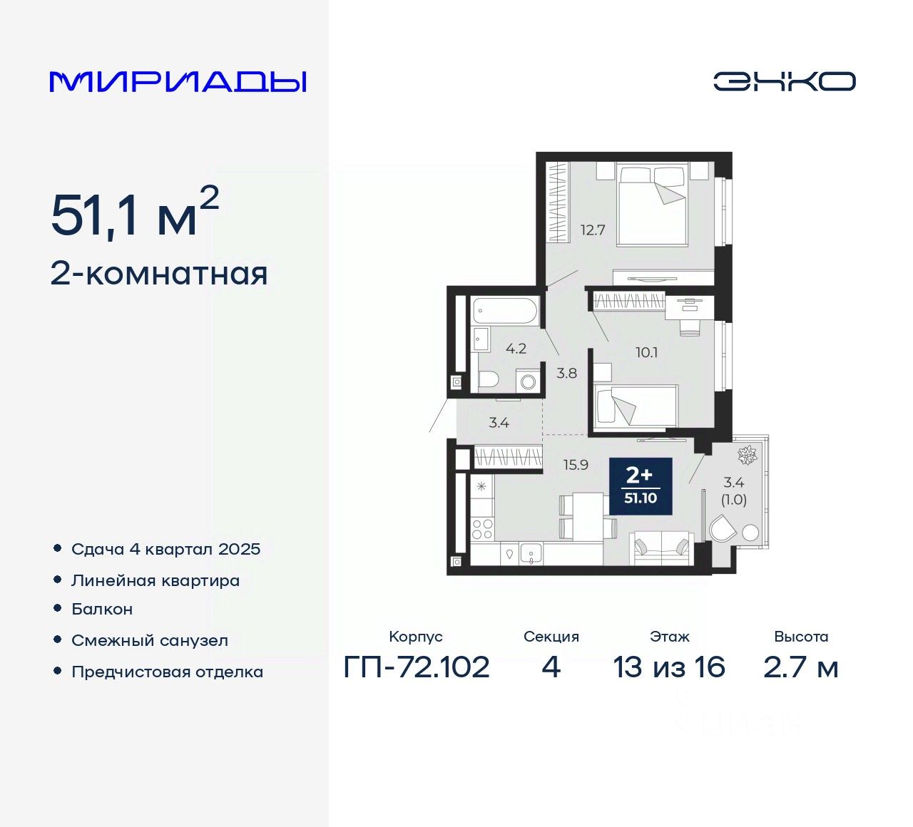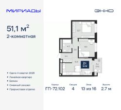 Просторная 2-комн. квартира с предчистовой отделкой в ЖК "Мириады" на 13 этаже. Общая площадь: 51.1 кв.м., жилая: 22.8 кв.м., площадь просторной кухни-столовой: 15.9 кв.м. Комнаты изолированные, все окна выходят на одну сторону. В квартире один балкон, один совмещенный санузел. Высота потолков 2.7 м.