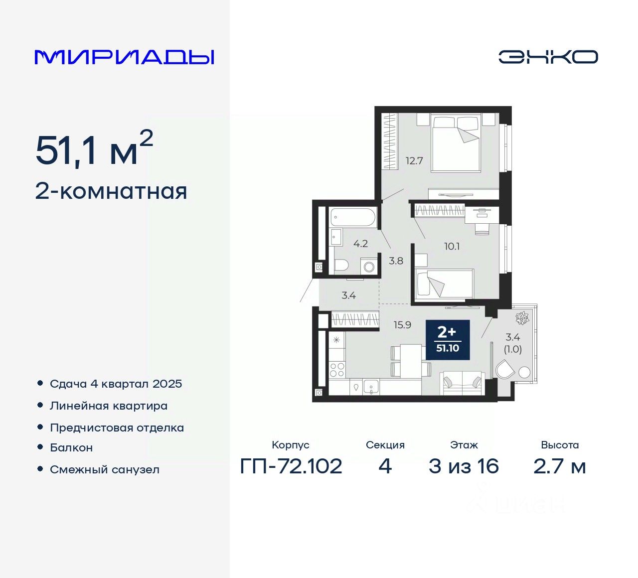 Продается двухкомнатная квартира с предчистовой отделкой в ЖК "Мириады" на 3 этаже. Общая площадь: 51.1 кв.м., жилая: 22.8 кв.м., площадь просторной кухни-столовой: 15.9 кв.м. Комнаты изолированные, все окна выходят на одну сторону. В квартире один балкон, один совмещенный санузел. Высота потолков 2.7 м.