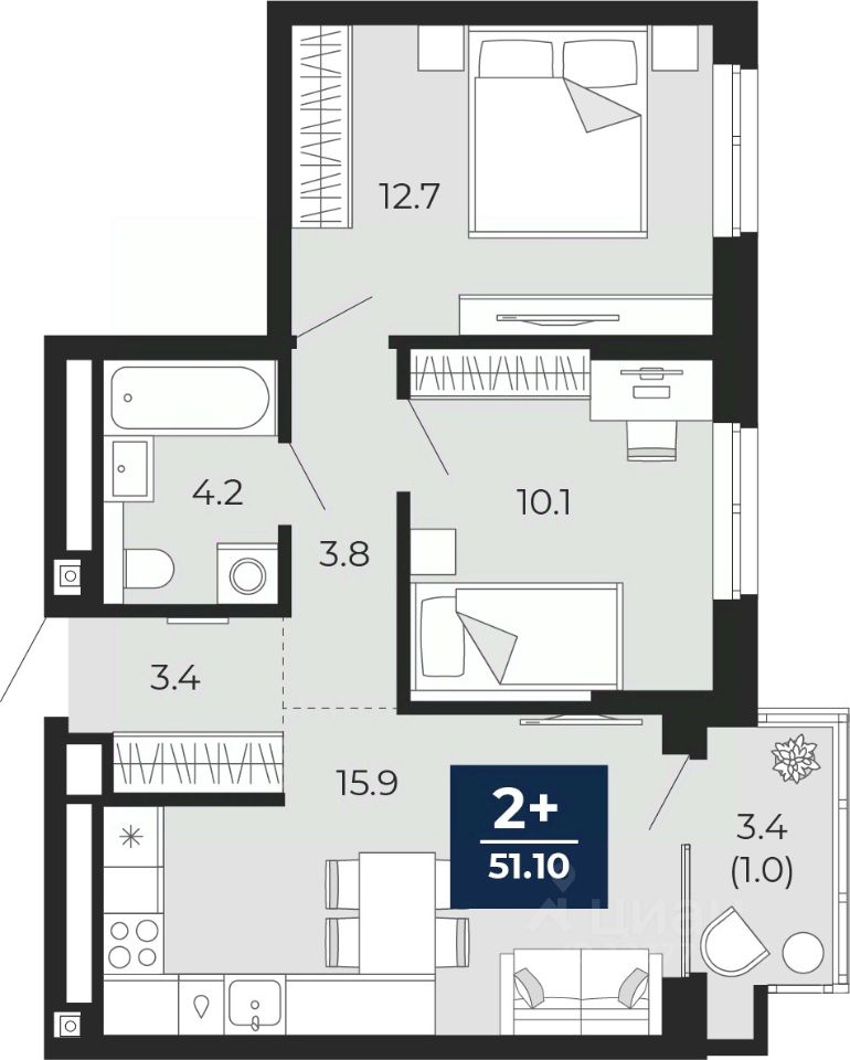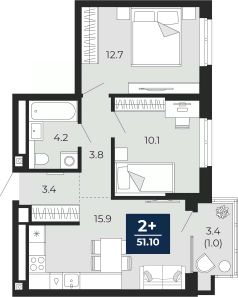 Продается двухкомнатная квартира с предчистовой отделкой в ЖК "Мириады" на 8 этаже. Общая площадь: 51.1 кв.м., жилая: 22.8 кв.м., площадь просторной кухни-столовой: 15.9 кв.м. Комнаты изолированные, все окна выходят на одну сторону. В квартире один балкон, один совмещенный санузел. Высота потолков 2.7 м.