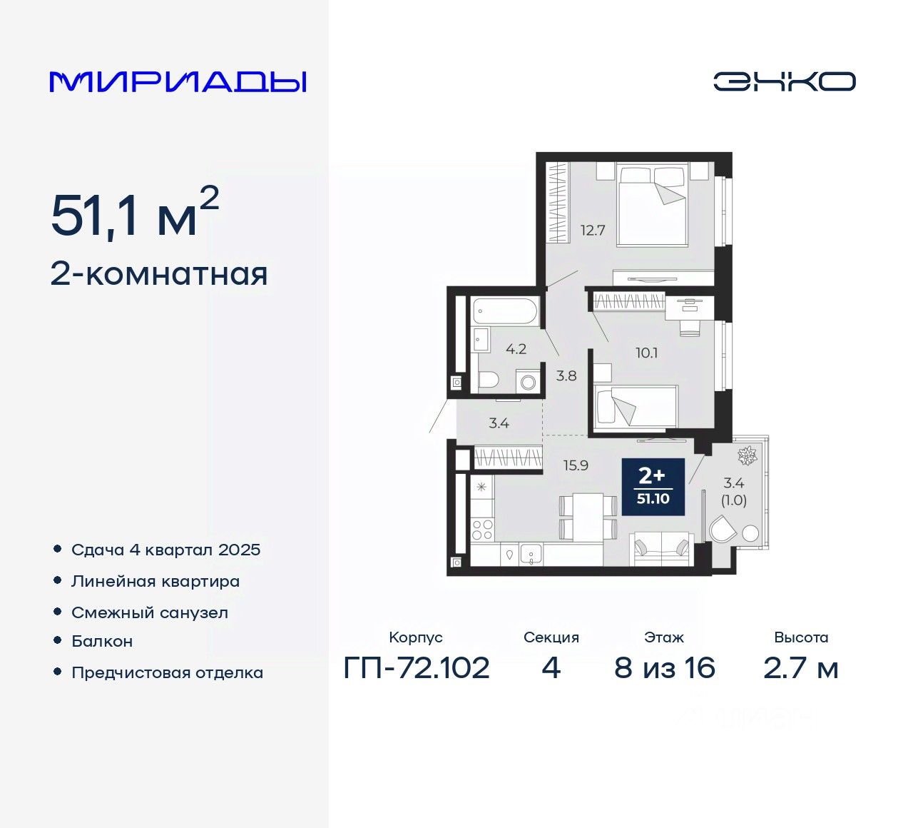 Просторная двухкомнатная квартира с предчистовой отделкой в ЖК "Мириады" на 8 этаже. Общая площадь: 51.1 кв.м., жилая: 22.8 кв.м., площадь просторной кухни-столовой: 15.9 кв.м. Комнаты изолированные, все окна выходят на одну сторону. В квартире один балкон, один совмещенный санузел. Высота потолков 2.7 м.