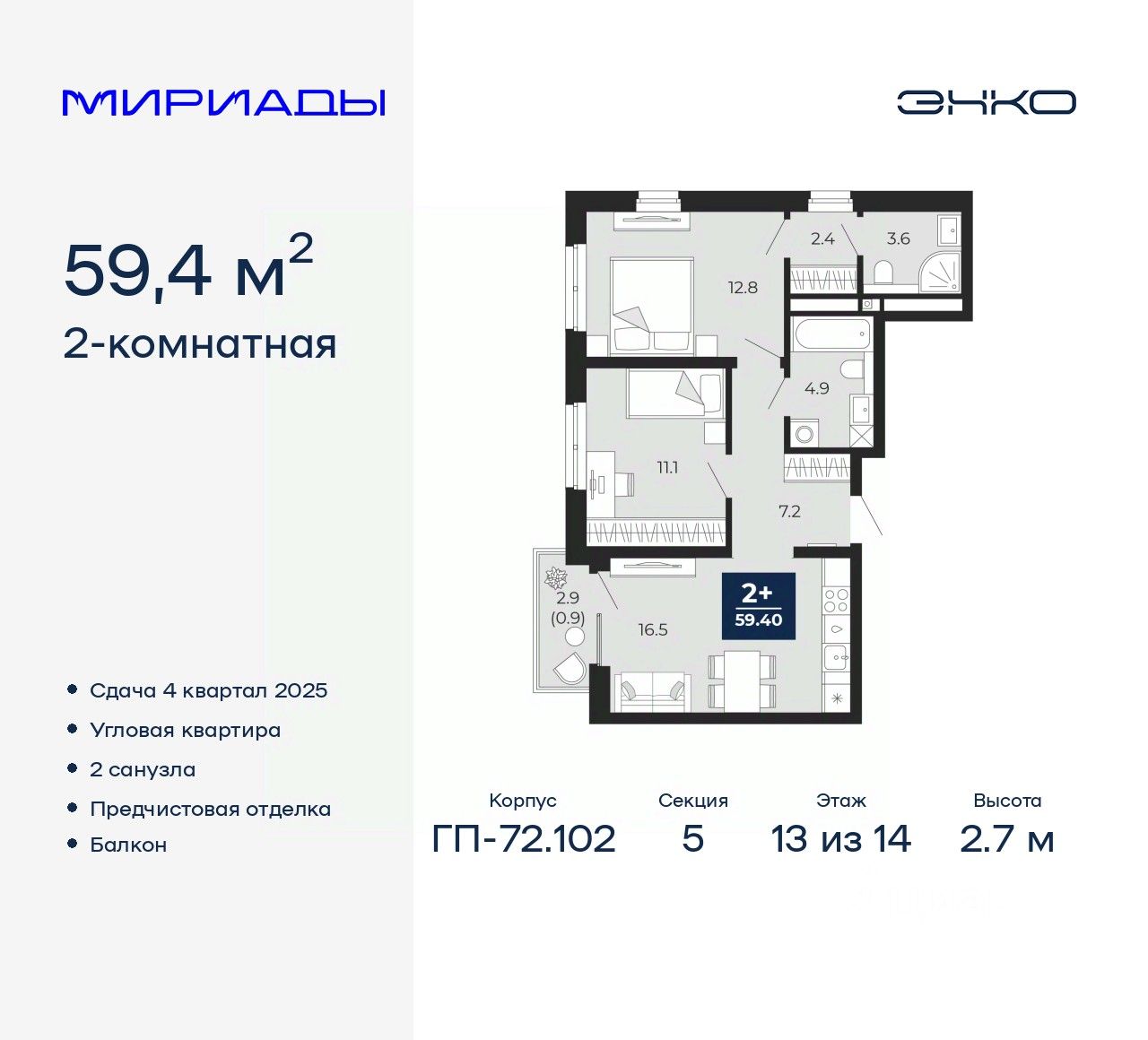 2-комн. квартира с предчистовой отделкой в ЖК "Мириады" на 13 этаже. Общая площадь: 59.4 кв.м., жилая: 23.9 кв.м., площадь просторной кухни-столовой: 16.5 кв.м. Угловая квартира, окна oбecпeчивaют paвнoмepнoe ocвeщeниe в тeчeниe дня. В квартире один балкон, два совмещенных санузла. Высота потолков 2.7 м.