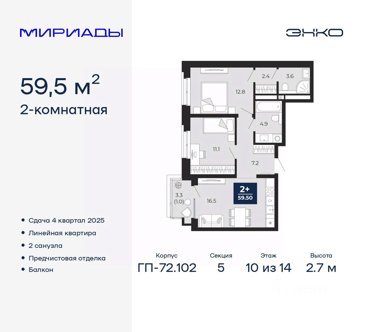 Продается 2-комн. квартира от застройщика с предчистовой отделкой в ЖК "Мириады" на 10 этаже. Общая площадь: 59.5 кв.м., жилая: 23.9 кв.м., площадь просторной кухни-столовой: 16.5 кв.м. Комнаты изолированные, все окна выходят на одну сторону. В квартире один балкон, два совмещенных санузла. Высота потолков 2.7 м.