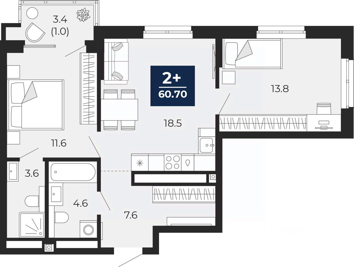 Просторная 2-комн. квартира с предчистовой отделкой в ЖК "Мириады" на 8 этаже. Общая площадь: 60.7 кв.м., жилая: 25.4 кв.м., площадь просторной кухни-столовой: 18.5 кв.м. Квартира угловая, окна oбecпeчивaют paвнoмepнoe ocвeщeниe в тeчeниe дня. В квартире один балкон, два совмещенных санузла. Высота потолков 2.7 м.