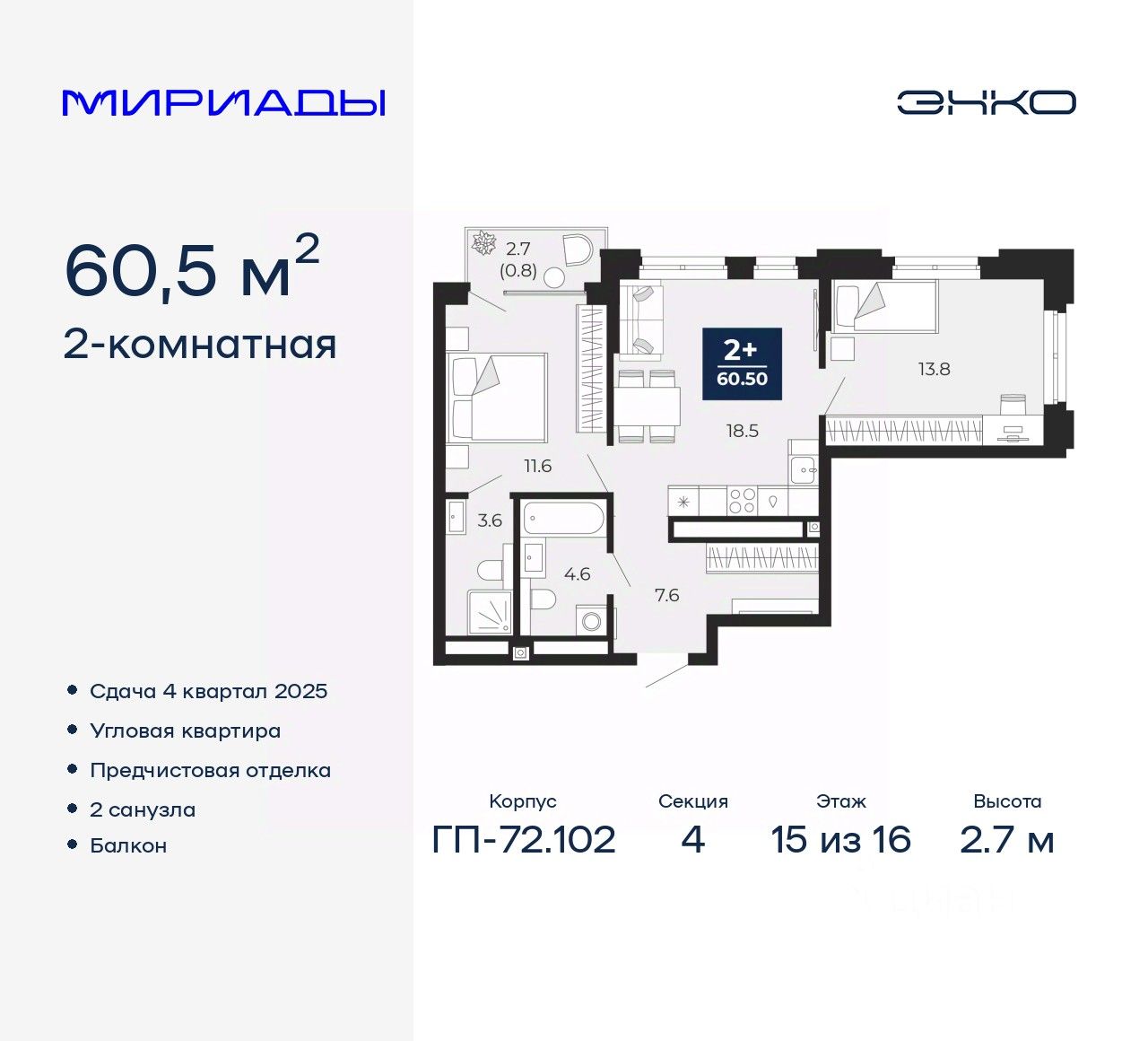 2-комн. квартира с предчистовой отделкой в ЖК "Мириады" на 15 этаже. Общая площадь: 60.5 кв.м., жилая: 25.4 кв.м., площадь просторной кухни-столовой: 18.5 кв.м. Квартира угловая, окна oбecпeчивaют paвнoмepнoe ocвeщeниe в тeчeниe дня. В квартире один балкон, два совмещенных санузла. Высота потолков 2.7 м.