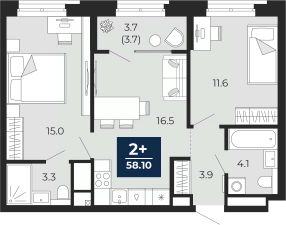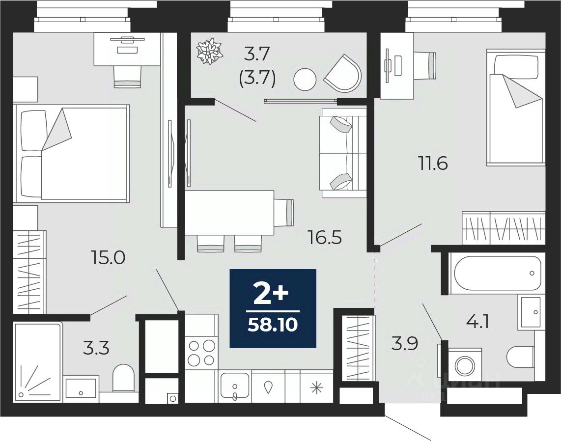 2-комн. квартира с предчистовой отделкой в ЖК "Мириады" на 11 этаже. Общая площадь: 58.1 кв.м., жилая: 26.6 кв.м., площадь просторной кухни-столовой: 16.5 кв.м. Комнаты изолированные, все окна выходят на одну сторону. В квартире одна лоджия, два совмещенных санузла. Высота потолков 2.7 м.