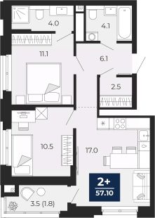 2-комн. квартира с предчистовой отделкой в ЖК "Мириады" на 11 этаже. Общая площадь: 57.1 кв.м., жилая: 21.6 кв.м., площадь просторной кухни-столовой: 17 кв.м. Угловая квартира, окна oбecпeчивaют paвнoмepнoe ocвeщeниe в тeчeниe дня. В квартире одна лоджия, два совмещенных санузла. Высота потолков 2.7 м.
