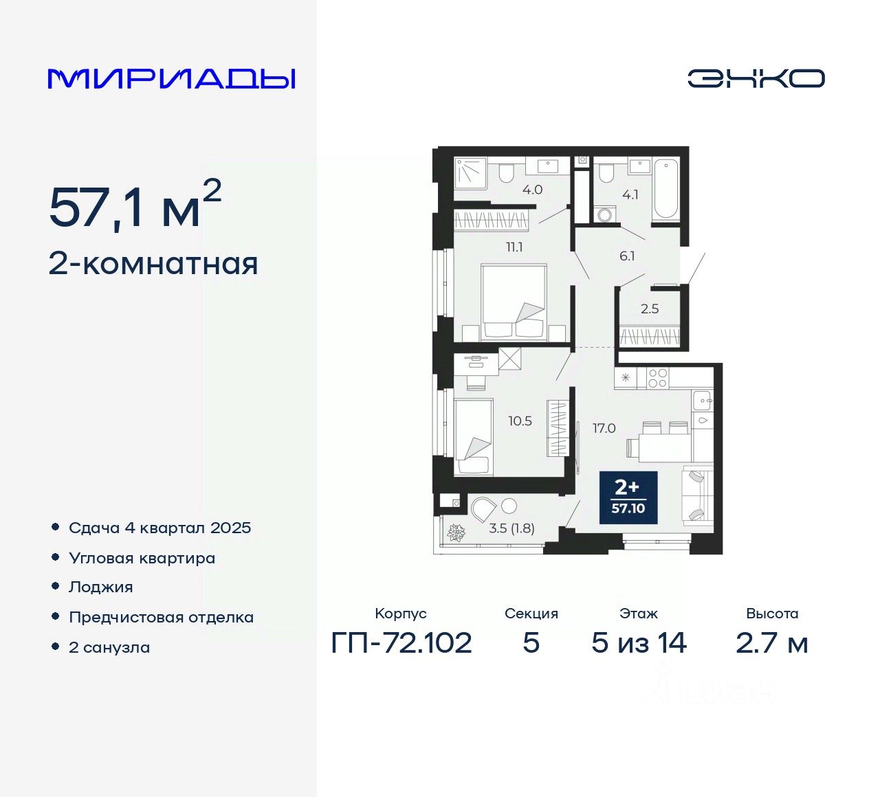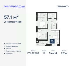 2-комн. квартира от застройщика с предчистовой отделкой в ЖК "Мириады" на 5 этаже. Общая площадь: 57.1 кв.м., жилая: 21.6 кв.м., площадь просторной кухни-столовой: 17 кв.м. Квартира угловая, очень светлая, естественная вентиляция при открытии окон. В квартире одна лоджия, два совмещенных санузла. Высота потолков 2.7 м.