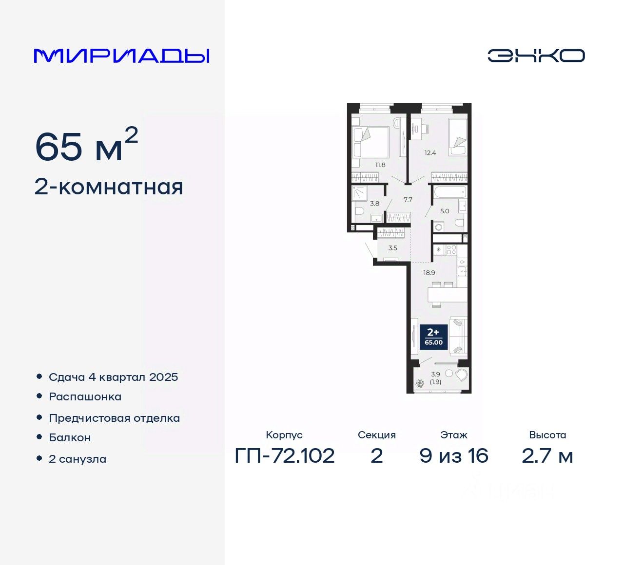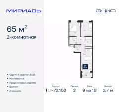 Просторная 2-комн. квартира с предчистовой отделкой в ЖК "Мириады" на 9 этаже. Общая площадь: 65 кв.м., жилая: 24.2 кв.м., площадь просторной кухни-столовой: 18.9 кв.м. Квартира - распашонка, без проходных комнат, окна выходят на paзные стороны дома. В квартире один балкон, два совмещенных санузла. Высота потолков 2.7 м.
