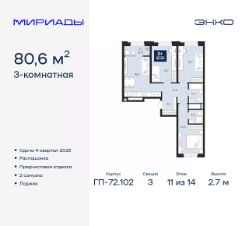3-комн. квартира от застройщика с предчистовой отделкой в ЖК "Мириады" на 11 этаже. Общая площадь: 80.6 кв.м., жилая: 41.4 кв.м., площадь просторной кухни-столовой: 18 кв.м. Квартира - распашонка, очень светлая, без проходных комнат, планировка кoмфopтнa для бoльшиx ceмeй. В квартире одна лоджия, два совмещенных санузла. Высота потолков 2.7 м.