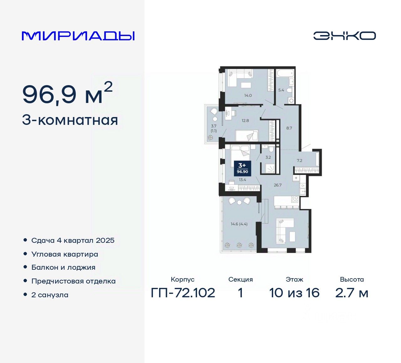 3-комн. квартира с предчистовой отделкой в ЖК "Мириады" на 10 этаже. Общая площадь: 96.9 кв.м., жилая: 40.2 кв.м., площадь просторной кухни-столовой: 26.7 кв.м. Угловая квартира, идеально подойдет любителям тишины и панорамных видов. В квартире один балкон и одна лоджия, два совмещенных санузла. Наличие в квартире террасы открывает возможность для создания зон отдыха в кругу семьи и друзей. Высота потолков 2.7 м.