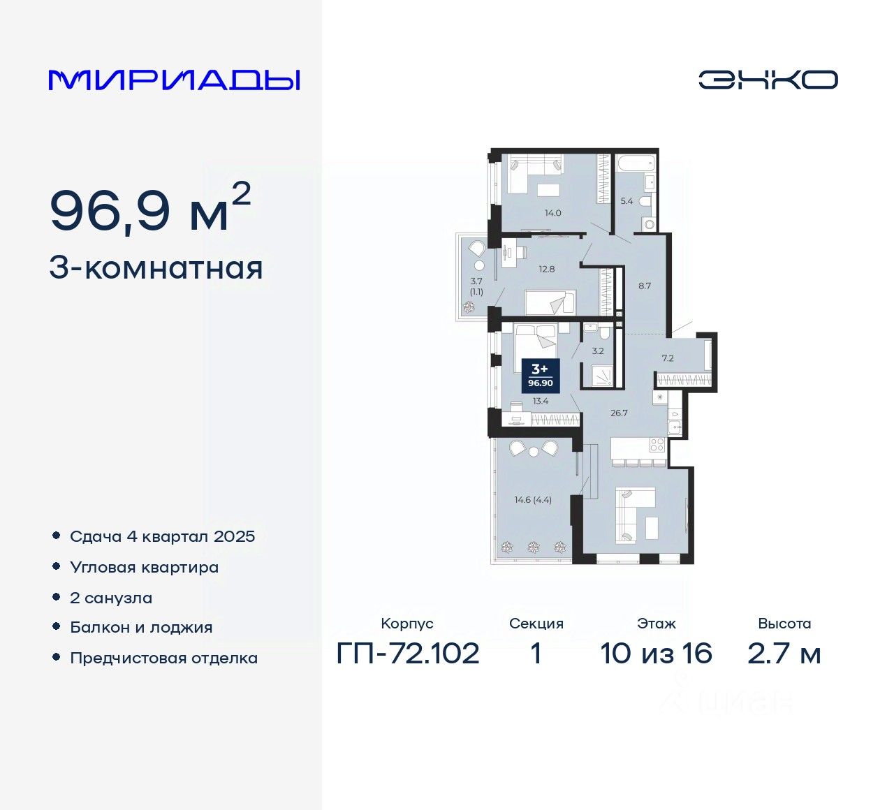 Продается 3-комн. квартира с предчистовой отделкой в ЖК "Мириады" на 10 этаже. Общая площадь: 96.9 кв.м., жилая: 40.2 кв.м., площадь просторной кухни-столовой: 26.7 кв.м. Квартира угловая, очень светлая, естественная вентиляция при открытии окон. В квартире один балкон и одна лоджия, два совмещенных санузла. Наличие в квартире террасы открывает возможность для обустройства дополнительной площади. Высота потолков 2.7 м.