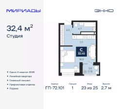 Продается 1-комн. квартира-студия от застройщика с предчистовой отделкой в ЖК "Мириады" на 23 этаже. Общая площадь: 32.4 кв.м., площадь гостиной 23.7 кв.м., из которых 7.7 кв.м. выделено под кухонную зону. Все окна выходят на одну сторону. В квартире одна лоджия, один совмещенный санузел. Высота потолков 2.7 м.