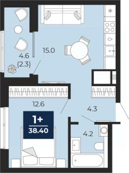 Однокомнатная квартира с предчистовой отделкой в ЖК "Мириады" на 6 этаже. Общая площадь: 38.4 кв.м., жилая: 12.6 кв.м., площадь просторной кухни-столовой: 15 кв.м. Все окна выходят на одну сторону. В квартире одна лоджия, один совмещенный санузел. Высота потолков 2.7 м.