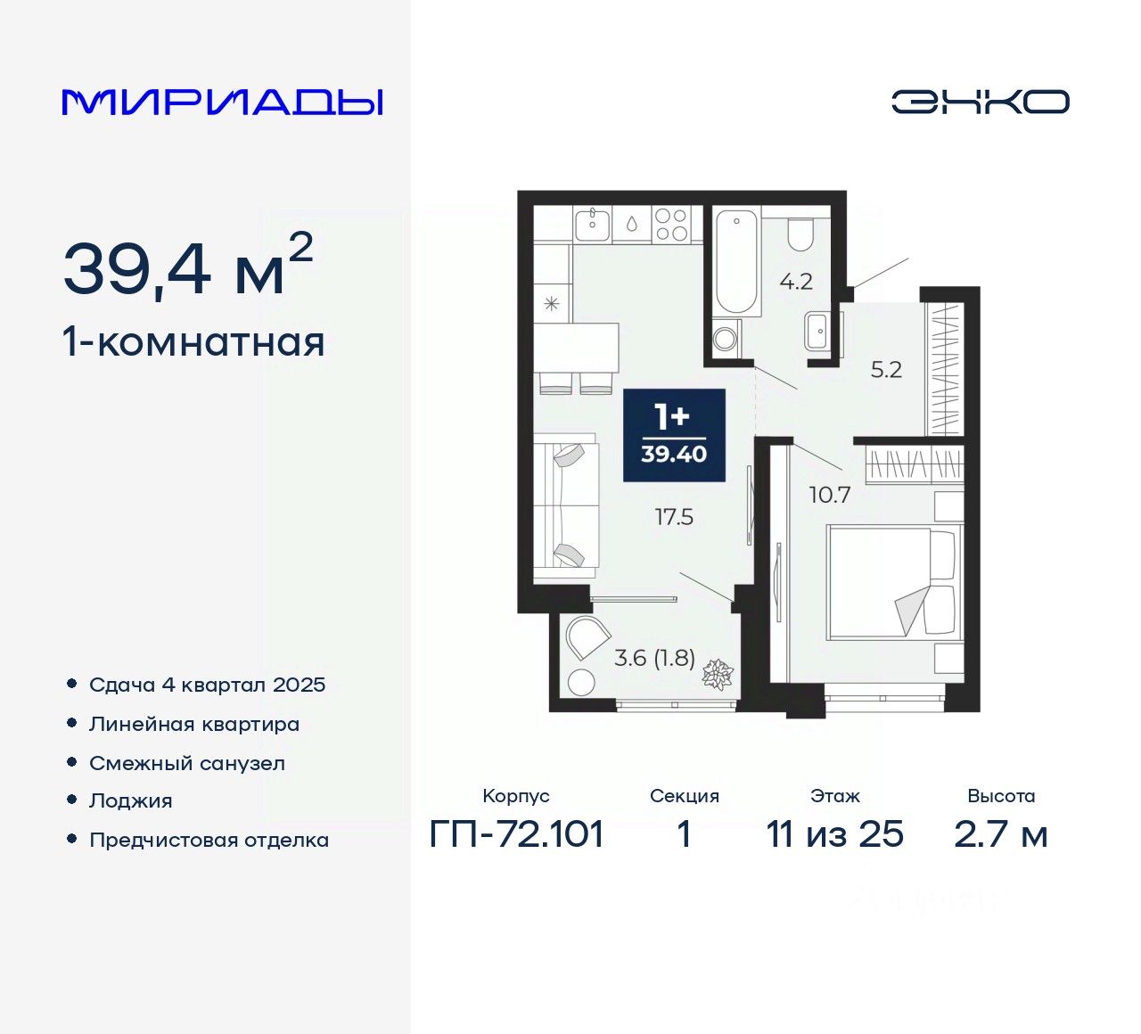 Продается 1-комн. квартира от застройщика с предчистовой отделкой в ЖК "Мириады" на 11 этаже. Общая площадь: 39.4 кв.м., жилая: 10.7 кв.м., площадь просторной кухни-столовой: 17.5 кв.м. Все окна выходят на одну сторону. В квартире одна лоджия, один совмещенный санузел. Высота потолков 2.7 м.
