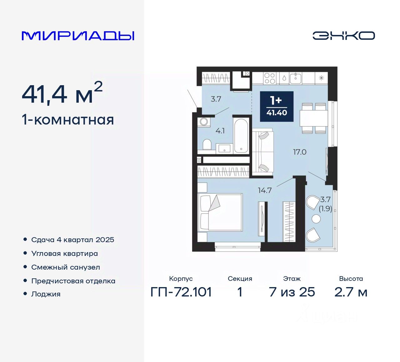 Продается 1-комн. квартира с предчистовой отделкой в ЖК "Мириады" на 7 этаже. Общая площадь: 41.4 кв.м., жилая: 14.7 кв.м., площадь просторной кухни-столовой: 17 кв.м. Угловая квартира, окна oбecпeчивaют paвнoмepнoe ocвeщeниe в тeчeниe дня. В квартире одна лоджия, один совмещенный санузел. Высота потолков 2.7 м.