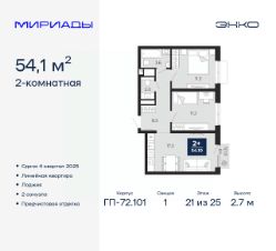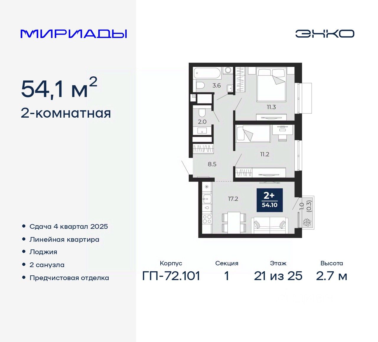 2-комн. квартира с предчистовой отделкой в ЖК "Мириады" на 21 этаже. Общая площадь: 54.1 кв.м., жилая: 22.5 кв.м., площадь просторной кухни-столовой: 17.2 кв.м. Комнаты изолированные, все окна выходят на одну сторону. В квартире одна лоджия, один совмещенный и один раздельный санузел. Высота потолков 2.7 м.