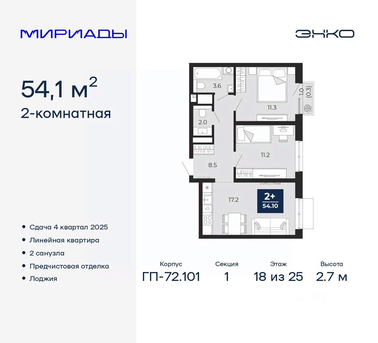 Двухкомнатная квартира с предчистовой отделкой в ЖК "Мириады" на 18 этаже. Общая площадь: 54.1 кв.м., жилая: 22.5 кв.м., площадь просторной кухни-столовой: 17.2 кв.м. Комнаты изолированные, все окна выходят на одну сторону. В квартире одна лоджия, один совмещенный и один раздельный санузел. Высота потолков 2.7 м.