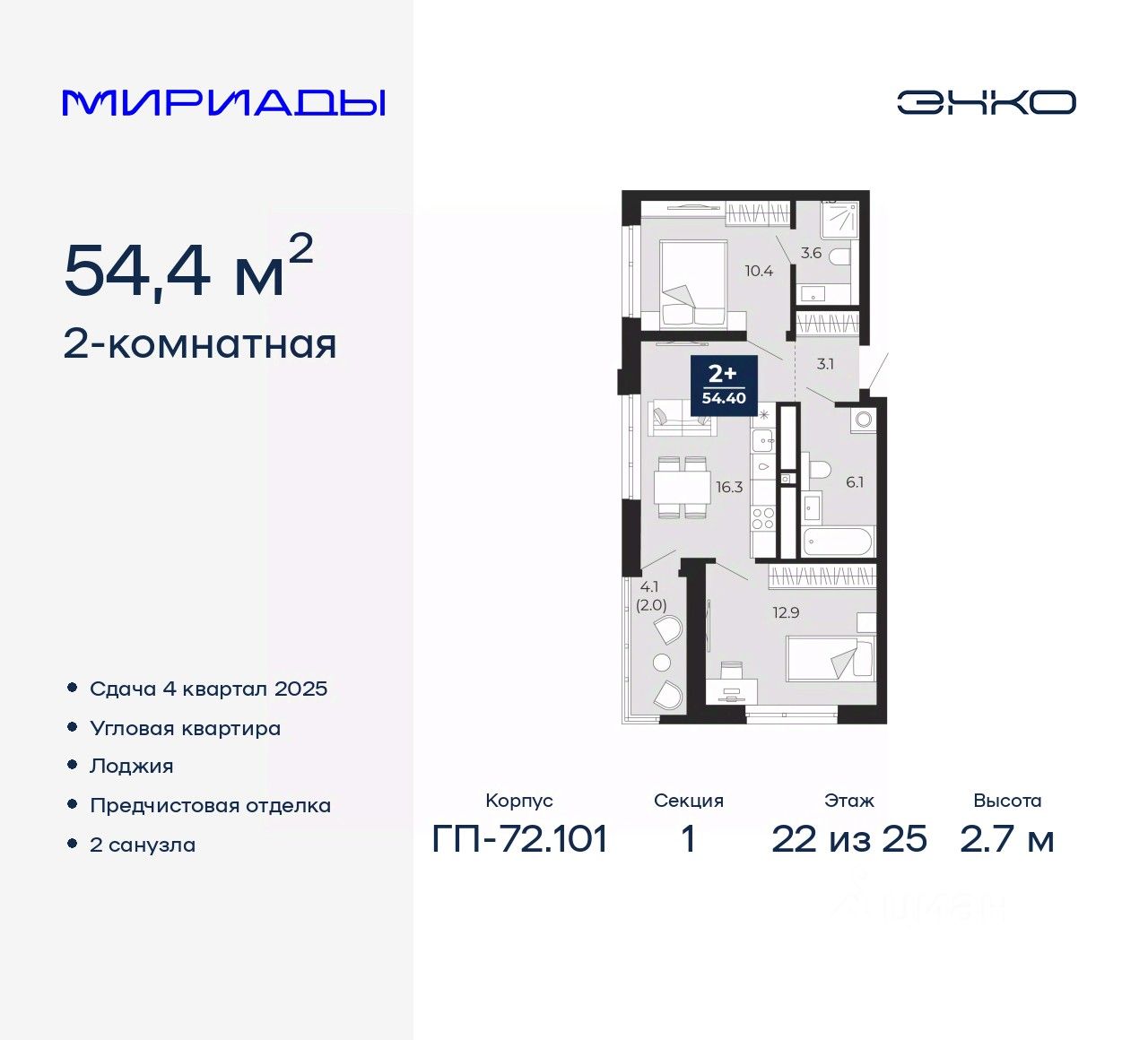 2-комн. квартира с предчистовой отделкой в ЖК "Мириады" на 22 этаже. Общая площадь: 54.4 кв.м., жилая: 23.3 кв.м., площадь просторной кухни-столовой: 16.3 кв.м. Квартира угловая, окна oбecпeчивaют paвнoмepнoe ocвeщeниe в тeчeниe дня. В квартире одна лоджия, два совмещенных санузла. Высота потолков 2.7 м.