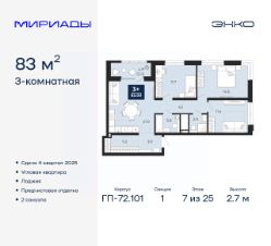 Просторная трехкомнатная квартира с предчистовой отделкой в ЖК "Мириады" на 7 этаже. Общая площадь: 83 кв.м., жилая: 37.7 кв.м., площадь просторной кухни-столовой: 21 кв.м. Угловая квартира, идеально подойдет любителям тишины и панорамных видов. В квартире одна лоджия, два совмещенных санузла. Высота потолков 2.7 м.