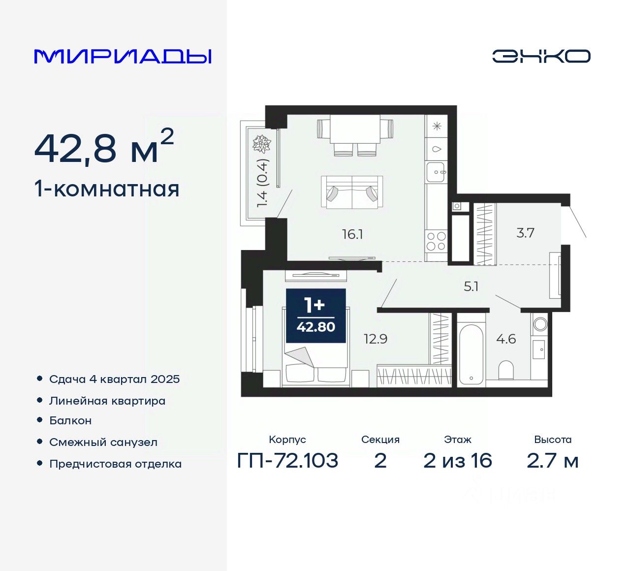1-комн. квартира от застройщика с предчистовой отделкой в ЖК "Мириады" на 2 этаже. Общая площадь: 42.8 кв.м., жилая: 12.9 кв.м., площадь просторной кухни-столовой: 16.1 кв.м. Все окна выходят на одну сторону. В квартире один балкон, один совмещенный санузел. Высота потолков 2.7 м.