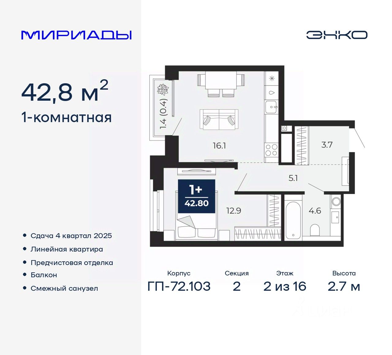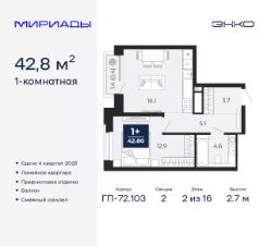 1-комн. квартира с предчистовой отделкой в ЖК "Мириады" на 2 этаже. Общая площадь: 42.8 кв.м., жилая: 12.9 кв.м., площадь просторной кухни-столовой: 16.1 кв.м. Все окна выходят на одну сторону. В квартире один балкон, один совмещенный санузел. Высота потолков 2.7 м.