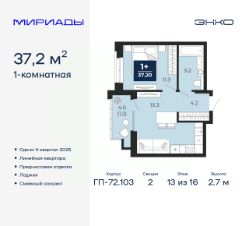 Просторная 1-комн. квартира с предчистовой отделкой в ЖК "Мириады" на 13 этаже. Общая площадь: 37.2 кв.м., жилая: 11.3 кв.м., площадь просторной кухни-столовой: 15.3 кв.м. Все окна выходят на одну сторону. В квартире одна лоджия, один совмещенный санузел. Высота потолков 2.7 м.