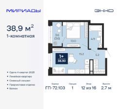 Просторная 1-комн. квартира с предчистовой отделкой в ЖК "Мириады" на 12 этаже. Общая площадь: 38.9 кв.м., жилая: 11.7 кв.м., площадь просторной кухни-столовой: 17.7 кв.м. Все окна выходят на одну сторону. В квартире один балкон, один совмещенный санузел. Высота потолков 2.7 м.
