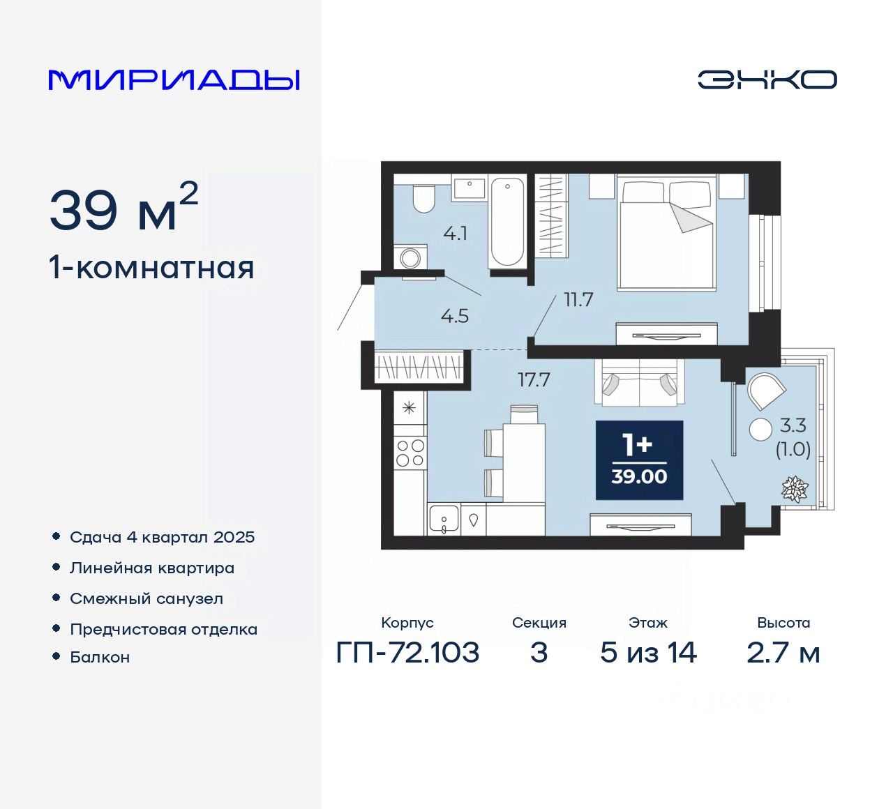 Продается 1-комн. квартира с предчистовой отделкой в ЖК "Мириады" на 5 этаже. Общая площадь: 39 кв.м., жилая: 11.7 кв.м., площадь просторной кухни-столовой: 17.7 кв.м. Все окна выходят на одну сторону. В квартире один балкон, один совмещенный санузел. Высота потолков 2.7 м.