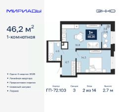 1-комн. квартира от застройщика с предчистовой отделкой в ЖК "Мириады" на 2 этаже. Общая площадь: 46.2 кв.м., жилая: 14.3 кв.м., площадь просторной кухни-столовой: 16.8 кв.м. Все окна выходят на одну сторону. В квартире одна лоджия, один совмещенный санузел. Высота потолков 2.7 м.