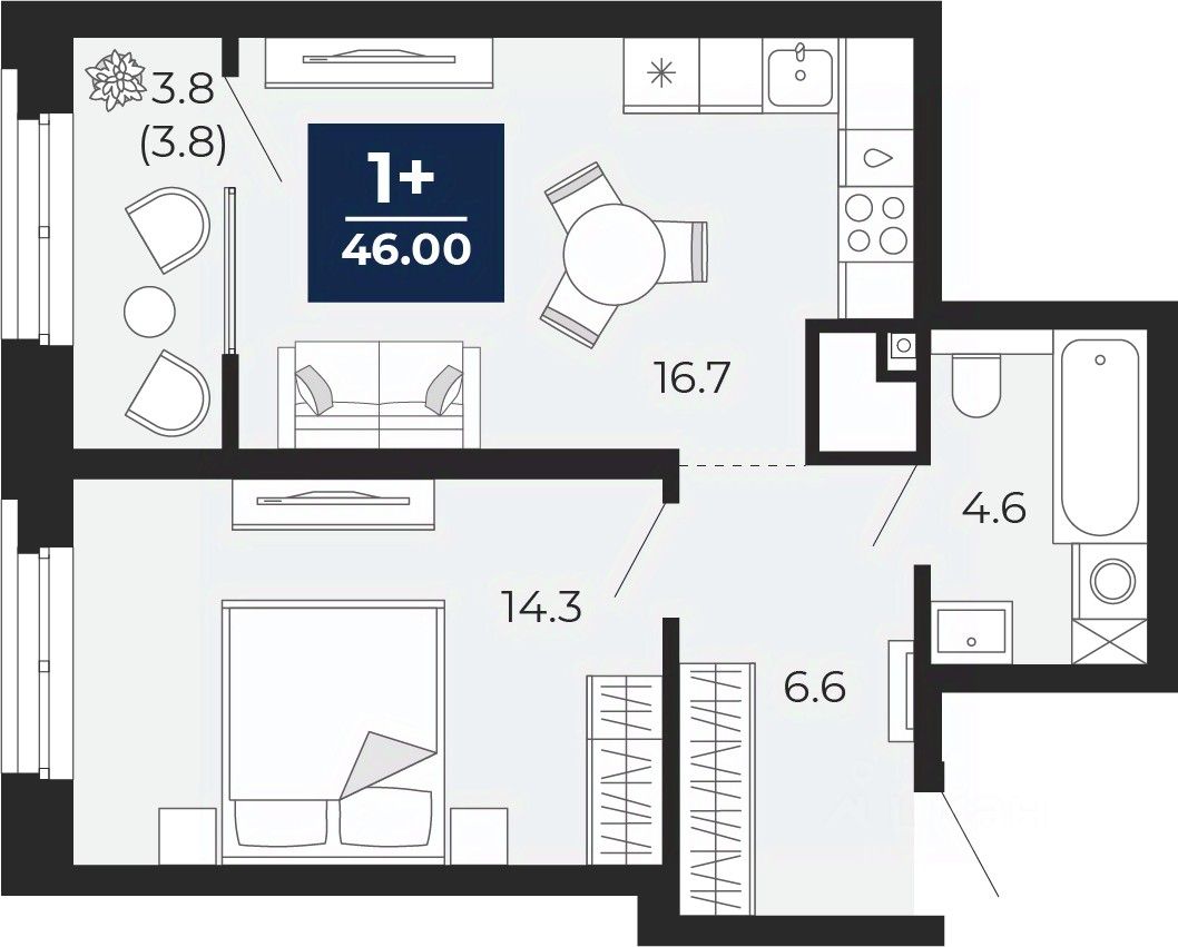 Просторная 1-комн. квартира с предчистовой отделкой в ЖК "Мириады" на 3 этаже. Общая площадь: 46 кв.м., жилая: 14.3 кв.м., площадь просторной кухни-столовой: 16.7 кв.м. Все окна выходят на одну сторону. В квартире одна лоджия, один совмещенный санузел. Высота потолков 2.7 м.