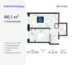 1-комн. квартира с предчистовой отделкой в ЖК "Мириады" на 13 этаже. Общая площадь: 46.1 кв.м., жилая: 10.3 кв.м., площадь просторной кухни-столовой: 20.9 кв.м. Все окна выходят на одну сторону. В квартире одна лоджия, один совмещенный санузел. Высота потолков 2.7 м.
