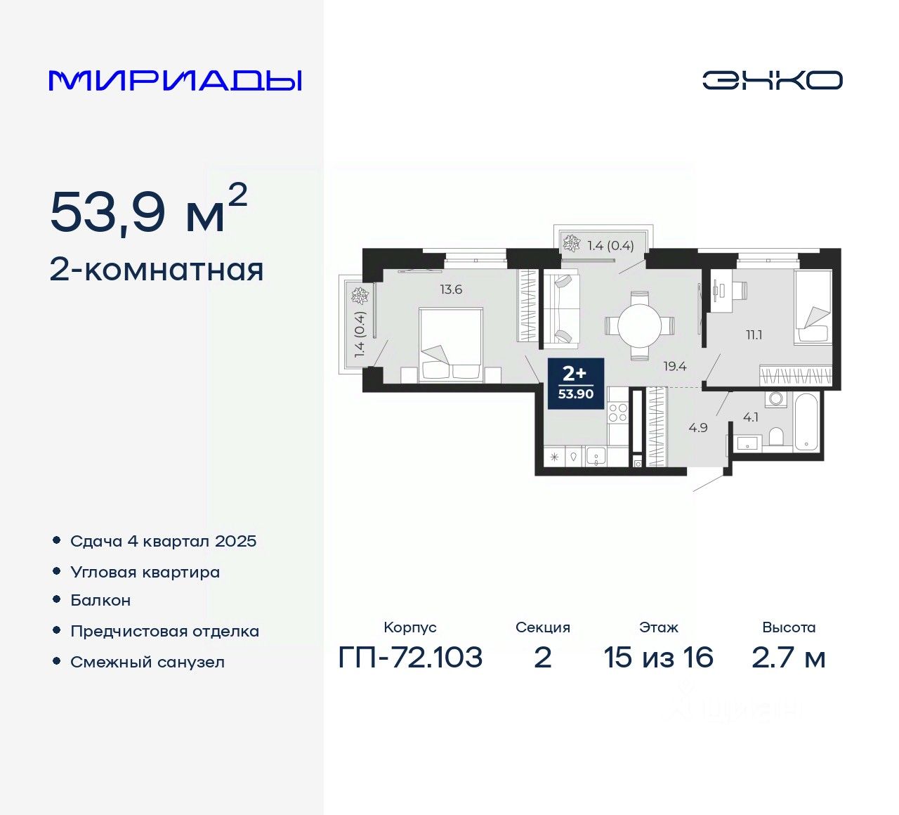 Двухкомнатная квартира от застройщика с предчистовой отделкой в ЖК "Мириады" на 15 этаже. Общая площадь: 53.9 кв.м., жилая: 24.7 кв.м., площадь просторной кухни-столовой: 19.4 кв.м. Квартира угловая, окна oбecпeчивaют paвнoмepнoe ocвeщeниe в тeчeниe дня. В квартире два балкона, один совмещенный санузел. Высота потолков 2.7 м.