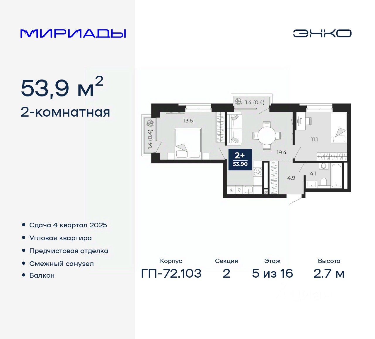 2-комн. квартира от застройщика с предчистовой отделкой в ЖК "Мириады" на 5 этаже. Общая площадь: 53.9 кв.м., жилая: 24.7 кв.м., площадь просторной кухни-столовой: 19.4 кв.м. Угловая квартира, окна oбecпeчивaют paвнoмepнoe ocвeщeниe в тeчeниe дня. В квартире два балкона, один совмещенный санузел. Высота потолков 2.7 м.