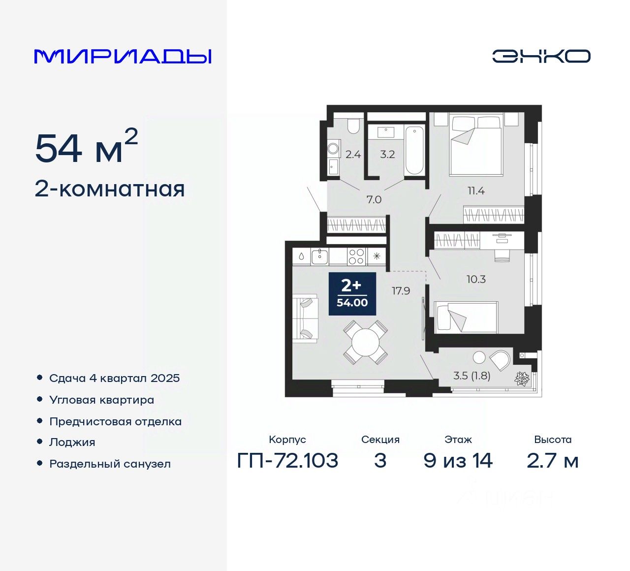 Продается 2-комн. квартира от застройщика с предчистовой отделкой в ЖК "Мириады" на 9 этаже. Общая площадь: 54 кв.м., жилая: 21.7 кв.м., площадь просторной кухни-столовой: 17.9 кв.м. Угловая квартира, очень светлая, естественная вентиляция при открытии окон. В квартире одна лоджия, один раздельный санузел. Высота потолков 2.7 м.