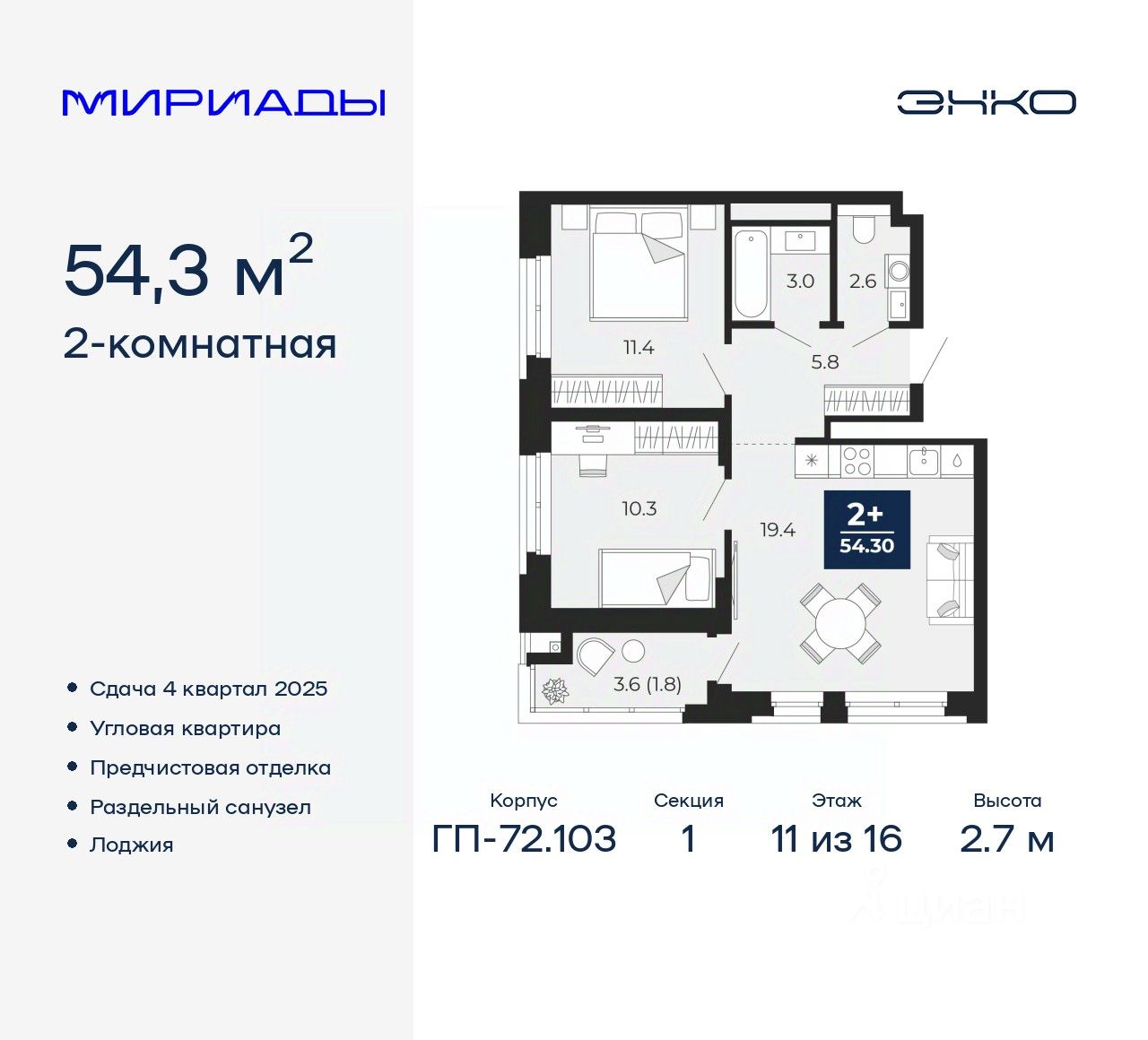 Продается двухкомнатная квартира с предчистовой отделкой в ЖК "Мириады" на 11 этаже. Общая площадь: 54.3 кв.м., жилая: 21.7 кв.м., площадь просторной кухни-столовой: 19.4 кв.м. Угловая квартира, идеально подойдет любителям тишины и панорамных видов. В квартире одна лоджия, один раздельный санузел. Высота потолков 2.7 м.